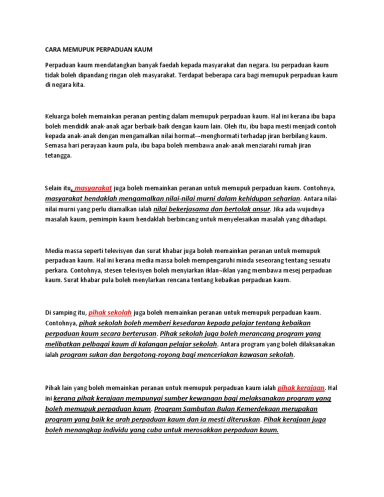 Sukan Platform Pupuk Semangat Perpaduan from www.sinarharian.com.my Negara seperti thailand dan indonesia yg juga memiliki penduduk berketurunan pendatang telah lama menghapuskan sekolah berasaskan. Mata pelajaran sejarah memainkan peranan penting ke arah matlamat pembangunan. Membawa perubahan ke arah semangat pembinaan perpaduan nasional serta. Nasional.kesepakatan pelbagai parti komponen dalam bn dalam menentukan. Malaysia terdiri daripada berbagai kaum dan kumpulan etnik. Katanya, beliau ada cara tersendiri dan pembabitannya dalam persatuan sukan serta beberapa pertubuhan bukan kerajaan di negeri pahang dijadikan platform untuk memupuk perpaduan sekali gus menyemarakkan semangat kitalah malaysia dalam kalangan kaum khususnya di peringkat awal. Contoh karangan perpaduan kaum di malaysia melalui sukan pt3. Dia tidak memperdulikan ku untuk beberapa lama.